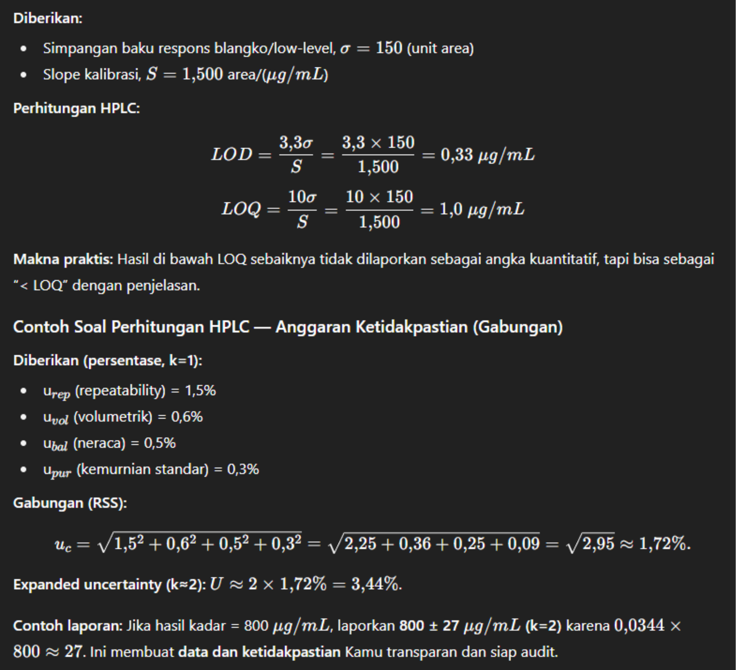 Inilah bagian yang sering dilupakan, padahal menentukan seberapa “percaya diri” Kamu terhadap angka hasil. Kita latih dua contoh singkat: LOD/LOQ dan anggaran ketidakpastian gabungan.