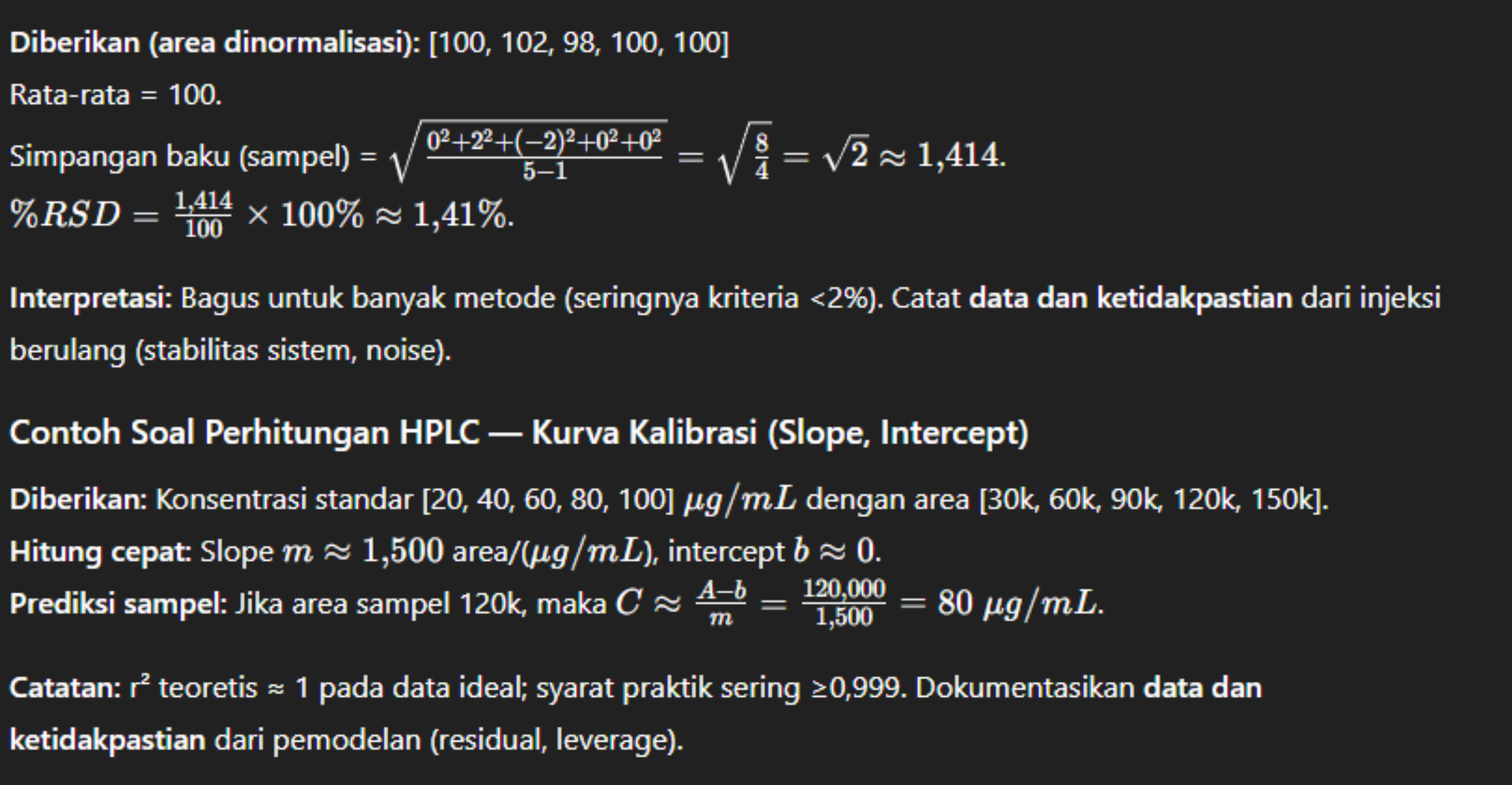 Sekarang kita masuk ke contoh yang sering jadi pertanyaan saat uji presisi (RSD), linearitas (slope/intercept), dan uji kesesuaian sistem. Tetap fokus: perhitungan HPLC harus transparan, dan data serta ketidakpastian perlu disisipkan dalam interpretasi.